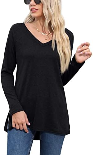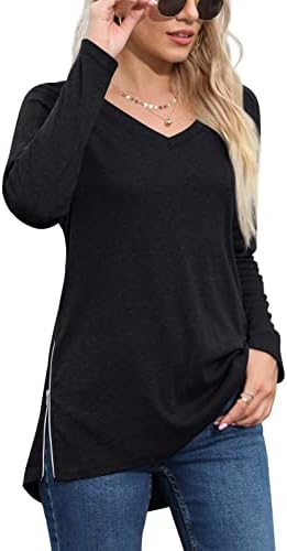 PrinStory Fall Womens Tops Casual V Neck Long Sleeves Tunic Shirt Split Top with Side Zipper