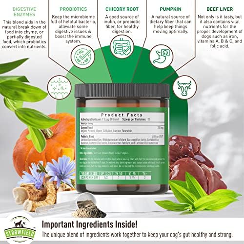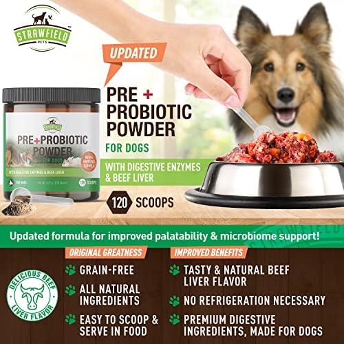 Probiotics for Dogs – 5 Billion CFU’s, Digestive Enzymes, Prebiotics – Dog Allergies, Diarrhea, Bad Dog Breath, Constipation, Gas, Yeast, Hot Spots – Powder Supplement – 120 Grams – Strawfield Pets