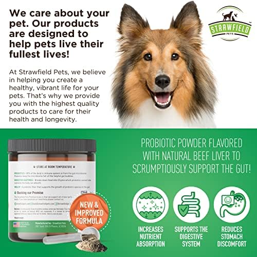 Strawfield Pets Pre & Probiotic Powder for Dogs is a probiotic supplement for dogs to help with digestion, immune system function and overall health. Our product contains over 8 ounces of powder per jar, which equals 120 scoops of pre & probiotics that are carefully crafted for small, medium, large & adult and senior dogs. Our beef & vegetable flavored powder has a unique 5 strain bacterial formula which has over 5 billion CFU’s per scoop. We also include a propriety enzyme blend with pumpkin to aid in overall digestion.
