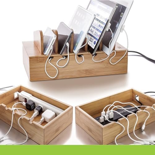 Keep up to five tablets and smartphones organized while hiding power strips and plugs inside this beautiful bamboo case that also includes slots for running and managing cables. Removable dividers allow you to store from one to up to five smartphones, tablets and other devices so they’re always in one easy to manage, easy to find location.