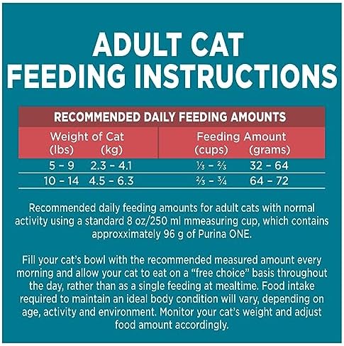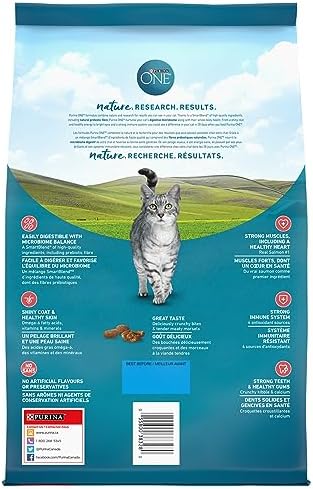 Serve your cat a plate of the deliciously crunchy bites and meaty, tender morsels she’s been craving with Purina ONE dry cat food with real salmon. We craft this natural cat food with real ingredients, including accents of real carrots and peas. Containing no artificial flavours or preservatives, this formula uses real salmon as the #1 ingredient to provide the protein your cat needs to support her strong muscles. The omega-6 fatty acids help nourish and maintain healthy skin and a radiant coat. Along with a great taste cats love, this meal delivers 100% complete and balanced nutrition for adult cats. The antioxidant blend in this dry cat food formula supports a strong immune system. Plus, the crunchy kibble helps reduce plaque buildup and whiten teeth. This nutritious cat food contains 0% fillers, so it’s no wonder that the Purina ONE cat food brand is veterinarian recommended. Show her how much you care by trying Purina ONE today.