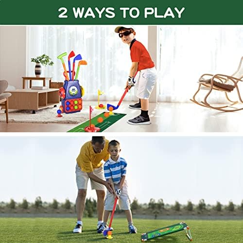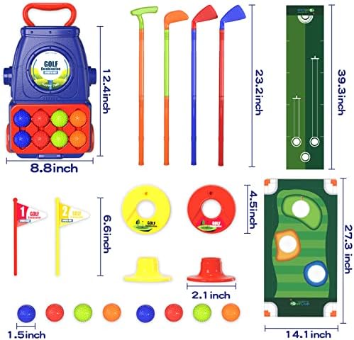 [UPGRADE KIDS GOLF CLUBS SET]- What you will get: 8 golf balls, 4 colorful golf clubs of different shapes and sizes(ajustable length: 12″ or 23.5″), 2 practice holes & bases, 1 cornhole board, 1 putting mat and 1 golf cart with 2 wheels for easy to drag and storage, which is designed for toddler boys & girls ages 3 4 5 6 7 8.