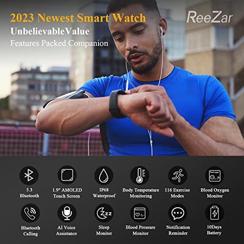 ReeZar Smart Watch for Men Women (1.9″ HD Touch Screen & Bluetooth5.3) Fitness Tracker Call/Dial IP68 Waterproof Heart Rate/Blood Pressure/SpO2/Sleep Monitor/Pedometer/AI Voice 116 Sport (Black)