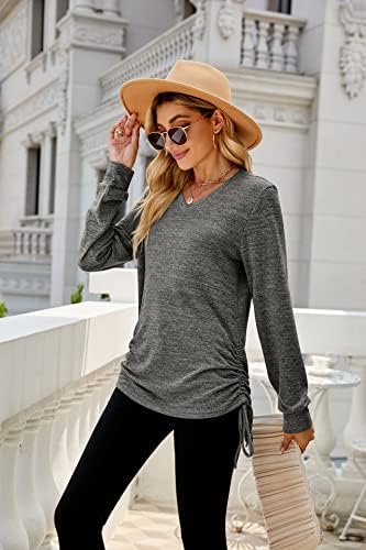 SEYOCRO Women Long Sleeve Casual Slim T Shirt Tops for Autumn Solid V Neck Pleated