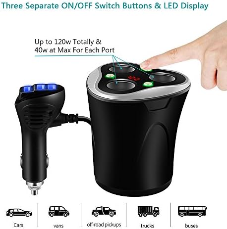 Cup shaped design & separate switch – designed to fit your car or truck’s cup holder, which makes your car much neater and save room. The shock-proof sponge mat on the bottom make it very stable when you drive on a bumpy road. The independent on/off switch for each cigar socket make all the connected devices under control, no need to plug in and out every time.