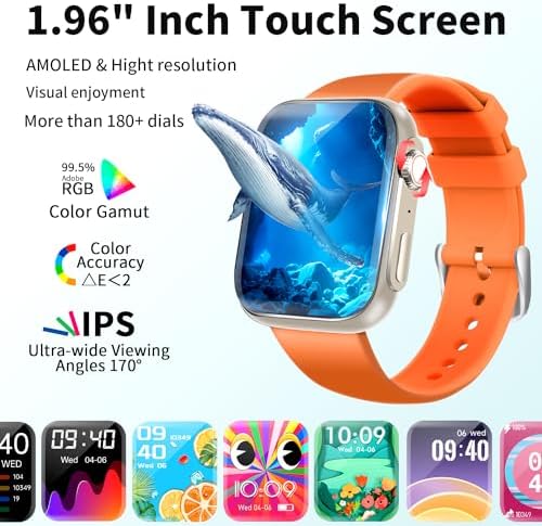 Smart Watch for Men Women (Answer/Make Call /1.96″ Screen) Fitness Tracker Heart Rate Blood Oxygen Monitor Blood Pressure IP68 Waterproof Activity Tracker Smartwatch for iOS Android (Orange)
