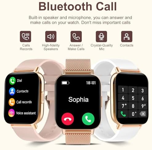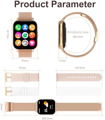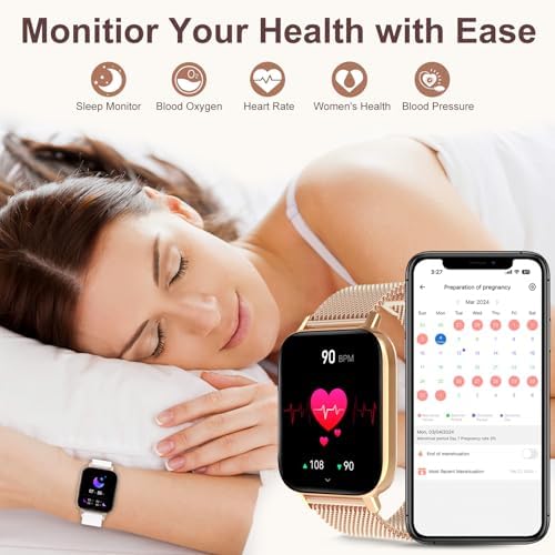 Sleep Monitor: Womens watches tracks sleep time from 9 p.m. to 9 a.m. You can record your sleep state, light sleep/deep sleep/wake up.24/7 Heart Rate Monitor: Sport watch can monitor heart rate automatically every 5 minutes all day. Track your heart rate data during exercise to get the best out of your workout.Boold Oxygen Monitor: Monitoring your Spo2 levels, learn about the body’s ability to absorb oxygen and the amount of oxygen delivered to the body, and help you live a healthier lifestyle.Blood Pressure Monitor: Best smart watches for women directly monitor and show your blood pressure and are recorded on the App at any time, anywhere.Women’s Health: Womens watch can help you keep track of your menstrual cycles and ovulation periods, and alert you before they arrive.