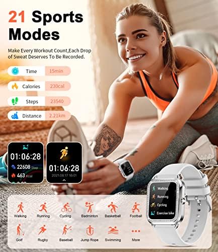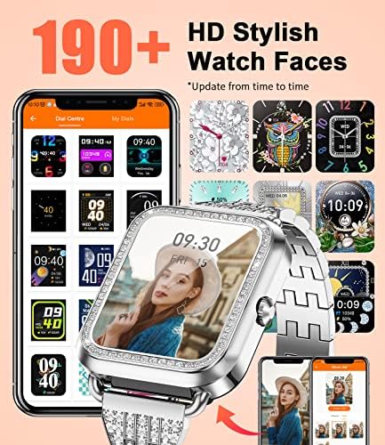Diamond Touchscreen:The dazzling Diamond Smart Women’s Watch features a 1.57-inch high-definition touchscreen, offering an exceptional visual experience while providing a responsive touch interface.Massive Dial : 9 Beautifully crafted local watch faces + access to over 200 stunning watch faces through the app + the ability to upload phone photos for customized watch faces.2 Watch Straps: A diamond-studded metal strap, splendid and dazzling, suitable for travel, social events, and work. A silicone strap, skin-friendly material, offering comfortable wear.SATISFACTION SERVICE: 7 days no reason to return, 12 months free wa-rranty. Any problem when you receive the watch please ask us, will solve it for you in 24 hours.