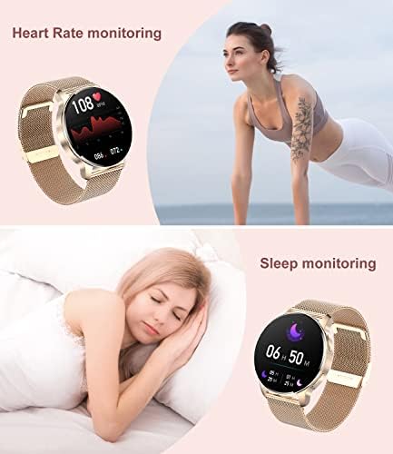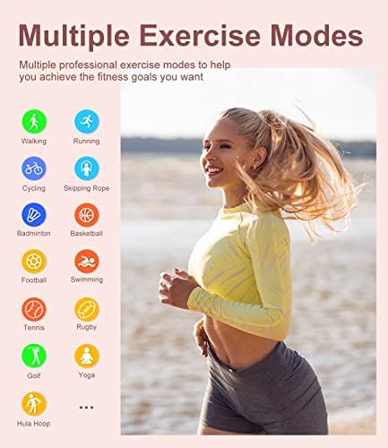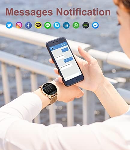 【Waterproof Workout Tracker】This lightweight women’s smartwatch has 20 kinds of workout mode, including walking, running, yoga. This fitness smart watch also has a bio-monitoring function, tracking 24Hour Heart rate/Calories/fitness metrics/steps/blood oxygen/pressure. You can use it to view and record your exercise data.