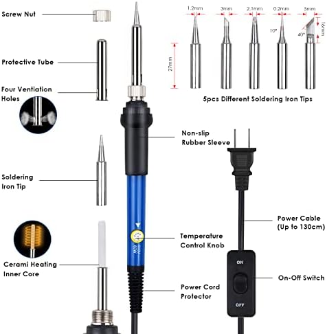 Soldering Iron Kit, TBTEEK 60W Welding Iron Kit Electronics with On-Off Switch & Adjustable Temperature, 5pcs Solder Iron Tips, Soldering Iron Stand, Desoldering Pump, Tweezers, Solder Wire, Carry Bag