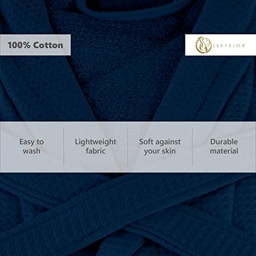 Superior 100% Cotton Waffle Robe with Terrycloth Lining and Shawl Collar, Oversized Unisex Hotel & Spa Bath Robes for Women and Men – Medium, Navy Blue