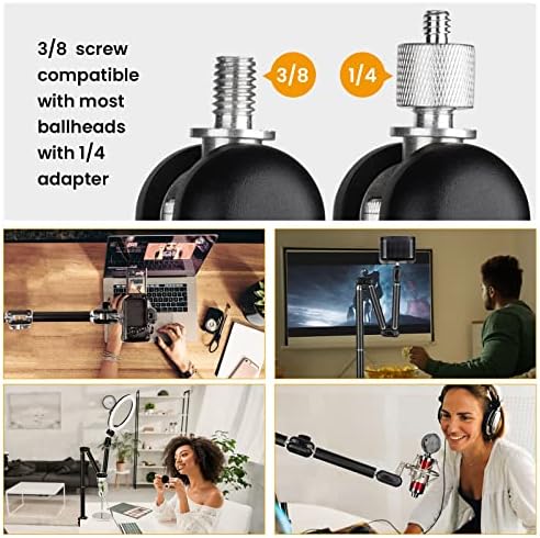 【SIZE COMPATIBILITY 】 There is a ⅜ screw on the head, compatible with most ball heads. A ¼ adapter is included in the scope of delivery and allows a number of photo & video equipment such as LED lights, cameras, projectors and flash lights to be attached. Removed from the table clamp, the arm has a ¼ thread on the foot, which means it can also be mounted on tripods or light stands