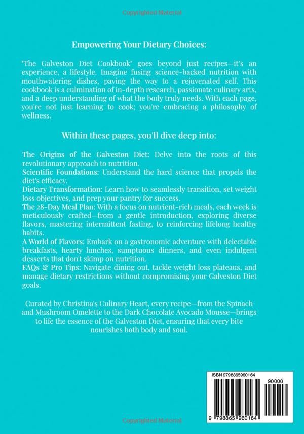 Within these pages, you’ll dive deep into:The Origins of the Galveston Diet: Delve into the roots of this revolutionary approach to nutrition.Scientific Foundations: Understand the hard science that propels the diet’s efficacy.Dietary Transformation: Learn how to seamlessly transition, set weight loss objectives, and prep your pantry for success.The 28-Day Meal Plan: With a focus on nutrient-rich meals, each week is meticulously crafted—from a gentle introduction, exploring diverse flavors, mastering intermittent fasting, to reinforcing lifelong healthy habits.A World of Flavors: Embark on a gastronomic adventure with delectable breakfasts, hearty lunches, sumptuous dinners, and even indulgent desserts that don’t skimp on nutrition.FAQs & Pro Tips: Navigate dining out, tackle weight loss plateaus, and manage dietary restrictions without compromising your Galveston Diet goals.