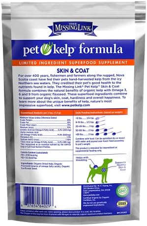 The Missing Link – Organic Pet Kelp, Skin & Coat Formula — Limited ingredient Superfood Supplement for Dogs rich in balanced Omegas 3, 6, and 9 to support healthy nutrition and skin & coat health — 8 oz.