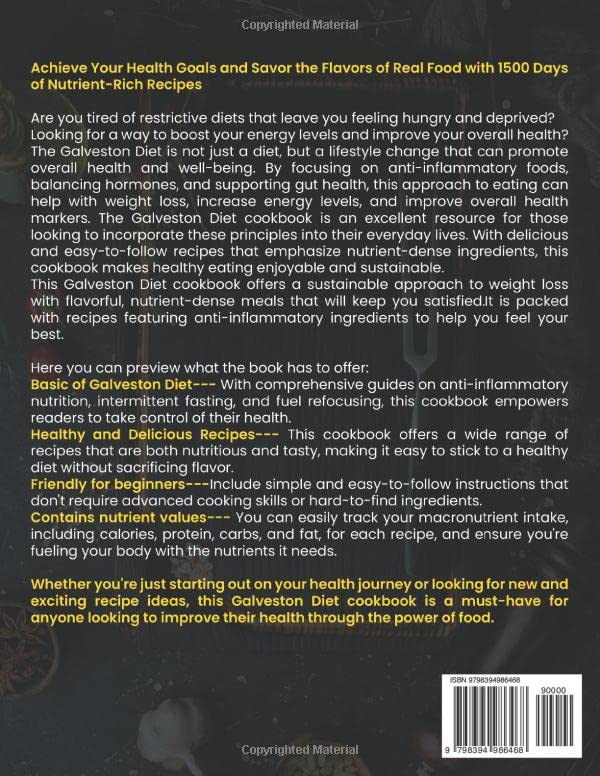 Basic of Galveston Diet— With comprehensive guides on anti-inflammatory nutrition, intermittent fasting, and fuel refocusing, this cookbook empowers readers to take control of their health.Healthy and Delicious Recipes— This cookbook offers a wide range of recipes that are both nutritious and tasty, making it easy to stick to a healthy diet without sacrificing flavor.Friendly for beginners—Include simple and easy-to-follow instructions that don’t require advanced cooking skills or hard-to-find ingredients.Contains nutrient values— You can easily track your macronutrient intake, including calories, protein, carbs, and fat, for each recipe, and ensure you’re fueling your body with the nutrients it needs.