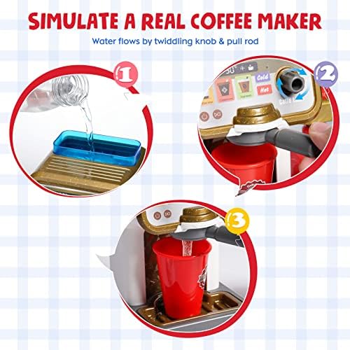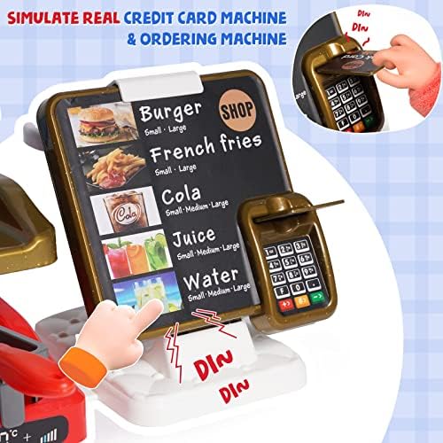 Encourages imaginative play: With realistic features like a coffee maker and cash register, this pretend play burger shop allows kids to role-play as restaurant owners and develop their creativity and social skills. The realistic coffee machine with knobs and water outlet for adding real water, adding more fun and realistic experience to the game.