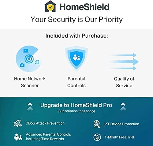 TP-Link HomeShield: TP-Link’s premium security services keep your home network safe with cutting-edge network and IoT protection. Free features: 1. Network Security Scan 2. Basic Parental Controls 3. QoS 4. Weekly/Monthly Reports 5. IoT Device Identification, HomeShield Pro paid service ads more robust protections and features. Get started with a one month free trail of Homeshield Pro