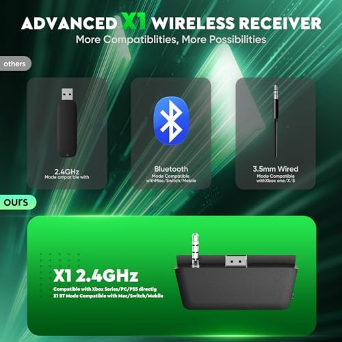 Wide Compatibility: Our wireless gaming headphones are equipped with both Bluetooth and 2.4G dual modes: ①. Allowing for wireless connection to Xbox controllers (Please note that the X1 Receiver only support the Official Controllers instead of the 3rd parties, and you need an extra Microsoft Adapter (Not Included) when connecting with an old version Xbox One controller) ②. as well as seamless compatibility with PC, PS5, laptops via a 2.4GHz receiver. ③. Mac and Switch supported by Bluetooth mode. Just plug and play for instant gaming immersion.