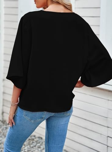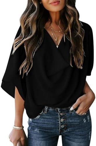 Drape v-neckline highlights collarbones and adds elegance3/4 sleeves provide coverage while keeping arms coolSlightly oversize style is more suitable for hot summer weatherThe women’s top is made of chiffon breathable lightweight fabric, and the short sleeved top provides you with a comfortable touch and coolness