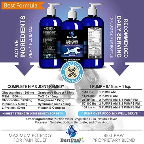 Best Paw Nutrition – Bacon Flavor Liquid Glucosamine for Dogs & Cats – Chondroitin, MSM, Hyaluronic Acid – Dog Arthritis Home Remedy – Joint Supplement for Hip & Joint Pain Relief Pets Love – 16oz