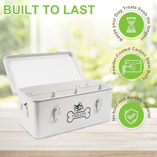 Brabtod Metal Dog Treat Container,Dog Treats Storage Box with Lid,White Pet Food Bin with Dividers,Rectangular Dog Cat Treats Organizer,Ideal for Sort,Great Gift for Pet Owners