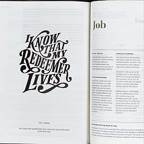 66 hand-lettered key verses125 full-color charts, infographics, and illustrations17 full-color timelines21 full-color mapsCurated reading plans for every book of the BibleOne-year Bible reading planDetailed book introductions and outlinesKey verse listSmyth-sewn lay-flat bindingLine-matched Bible textWide margins for notetakingBible Serif typeface designed for optimal Bible readingSingle-column text format8.5-point type sizeBlack-letter textRibbon marker for easy referencing between pagesSpecialized presentation page for gift-giving