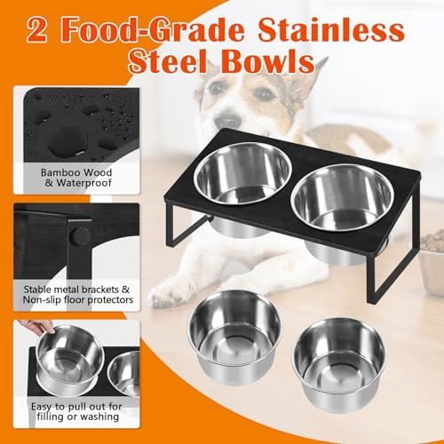 【Sturdy & Stable】The package is equipped with anti-slip pads at the bottom, and the widened and thickened frame makes the stainless steel dog bowls more stable. Natural bamboo board painted in black will fit well into most home décor.