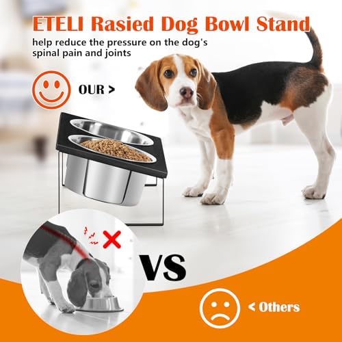【Reduces Strain On Joint】Dimensions: 16.5L × 7.9W × 4.1-6.3H. Compared with traditional dog bowls placed directly on the ground, ETELI elevated dog bowls adopt a 10° tilt design, with a lower front and a higher back, which helps reduce the pressure on the dog’s neck and joints when eating.
