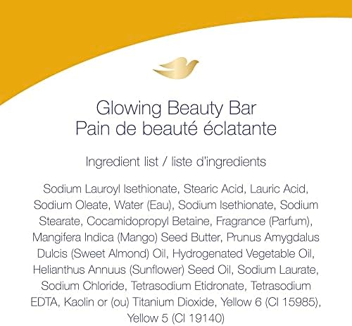 Dove Glowing Beauty Bar with Mango Butter and Almond Butter uses the rich moisture of mango butter to make every shower feel like a well-deserved treat. With the lush scent of juicy, ripe mango and sweet almond, this Beauty Bar and gentle skin cleanser contains 1/4 moisturizing cream so that it forms a luxurious lather and helps your skin to feel soft and hydrated every time you use it —for pampering that lasts long after you towel off. This cleansing bar is gentle on your body and the environment, combining the cleansing power of bath soap with the skin-soothing properties of a Beauty Bar. At Dove, we believe bath time should give you a moment to relax, recharge, and rejuvenate and our mango butter bar soap Beauty Bar offers a fresh new alternative to African black soap, sandalwood soap, shea butter soap, coconut soap and coconut oil soap, exfoliating soap, and other bath soaps. Using this body soap leaves skin supple and moisturized long after showering —making it a wonderful way to add some self-care to your bath or shower routines. A tropical treat designed to be enjoyed every single day, this bath soap is sure to be a new favorite and a welcome addition to your bathtime collection. Dove has been recognized for its responsible and Cruelty-Free practices, and was added to the PETA Cruelty-Free list “Beauty Without Bunnies.” This body soap adheres to those strict standards, too. This beauty bar goes great with Dove Body Wash Mango and Almond Butter and Dove Skin Care Mango and Almond Butter.