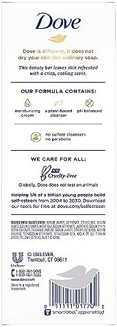 #1 DERMATOLOGIST RECOMMENDED: Formulated with mild cleansers and ¼ moisturizing cream, Dove moisturizing beauty bar leaves skin soft and smooth with every shower.