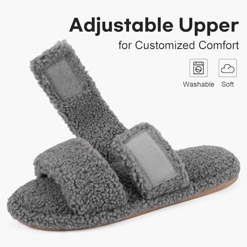 FamilyFairy Open Toe Slippers for Women Adjustable Memory Foam House Shoes Faux Fur Fuzzy Slide Sandals Non Slip Washable
