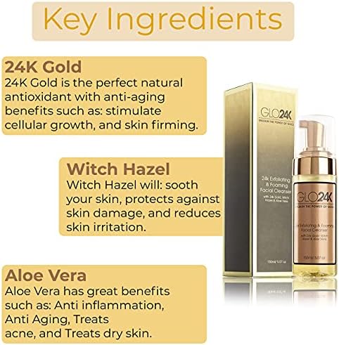 GLO24K Exfoliating & Foaming Facial Cleanser with 24k Gold, Witch Hazel, and Aloe Vera. For an Everyday Beauty Routine.
