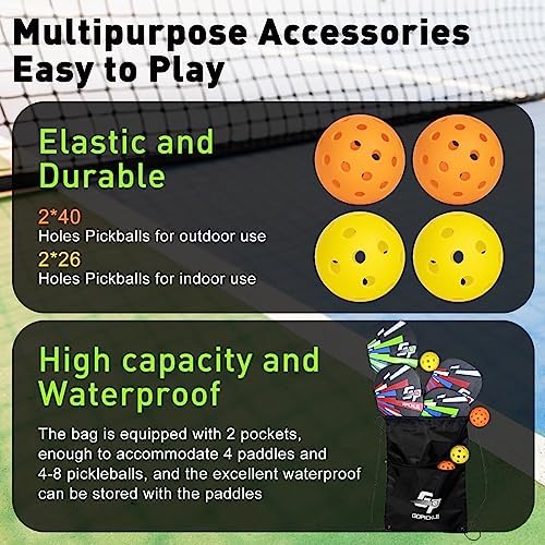 🎾【PREMIUM PICKLEBALL PADDLES SET】 GoPickle pickleball set contains 4 premium pickleball paddles, 4 pickleball balls (26 holes indoor balls & 40 holes outdoor balls), a waterproof carry bag. With this Pickleball set, you can play pickleball with your family and friends indoors and outdoors. Also, 4 pickleball rackets support 4 people to participate in. More people to play, more fun you will get. A popular outdoor games for adults!