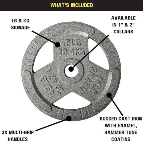 At the core of all weightlifting style strength training are weight plates and will be a welcomed addition to any proper home gym workout equipment setup. Strength & Conditioning work allows you to build durable muscle in your lower body, core, and upper body. Our Cast Iron Weight Plates feature both pound and kilogram signage for easy identification and they are finished with a robust layer of enamel that helps mitigate the potential for rust or scratching. Additionally, they are designed with Olympic style ergonomic grip that can be carried with relative ease, which can be used as a workout itself called a “Farmer’s Carry”. The machined hole allows for a tighter fit on any of our 1” or 2” Barbells. However, you may do plate only exercises like the floor press or plate halo’s in a way similar to using dumbbells or kettlebells. To start your healthy lifestyle, we recommend adding a barbell or curl bar and a pair clamp collars to the weight set. As you progress in your training regimen and become a workout warrior, you can get any of our Sport, Pro, or Elite Series Power Cages or Squat Stands to enhance your experience.