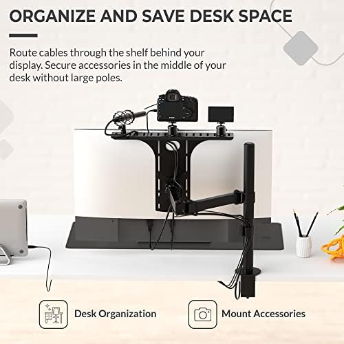 Secure a DSLR camera, webcam light, microphone, or webcam above your monitor using 1/4 20 screws. Stay organized and route cables through the shelf behind your screen.