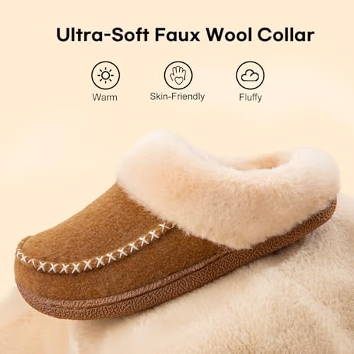 LongBay Women’s Moccasin Slippers Faux Wool Felt Slip-On Bedroom Clog Comfy Memory Foam Indoor Outdoor House Shoes with Fuzzy Collar