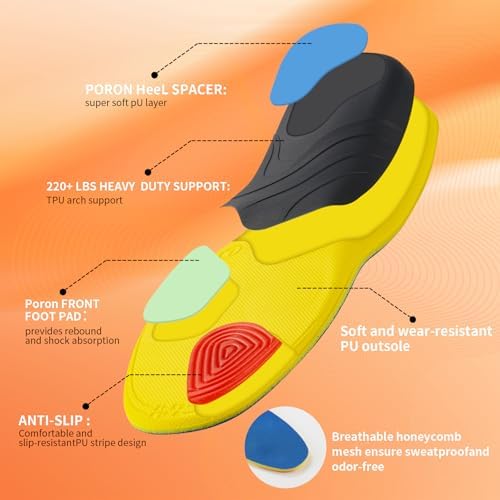 🦶【COMFORT MATERIAL】:The sports insoles feature Double shock-absorbing pads excellent for shock absorption and dual elasticity ,heel cups for heel pain relief.The shoe soles black hard TPU material supports the arch of your,Anti-slip PU stripe design on the bottom of the big toe.The comfort fabric is made from breathable mesh to keep you cool and breathable and reduce odor.