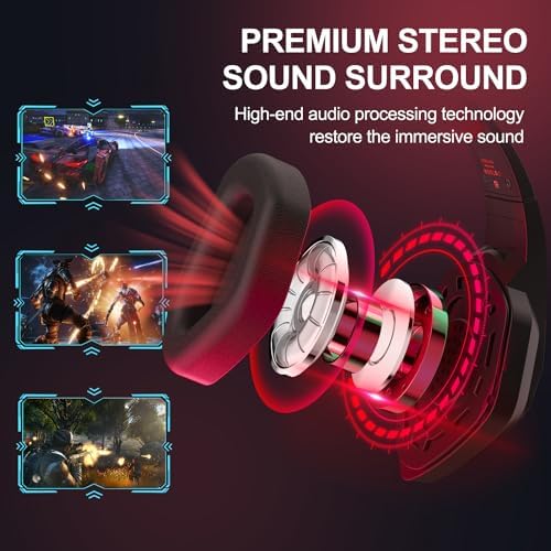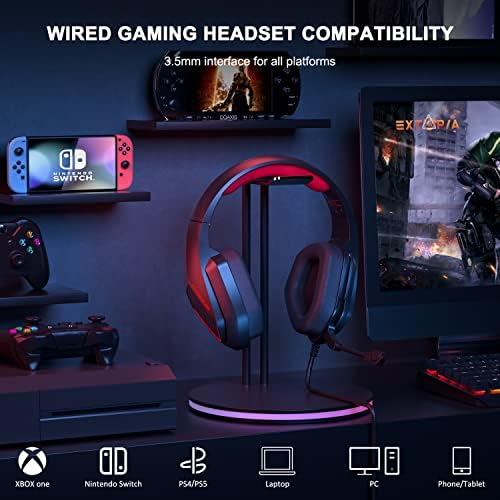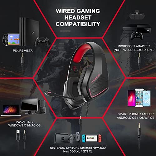 PS4 Gaming Headset for PC Xbox One PS5 Switch, H5 Over Ear Stereo Headphones with Noise Cancelling Mic, LED Light, 3.5mm Wired Headset for Laptop Tablet Phone NES Games (Red)