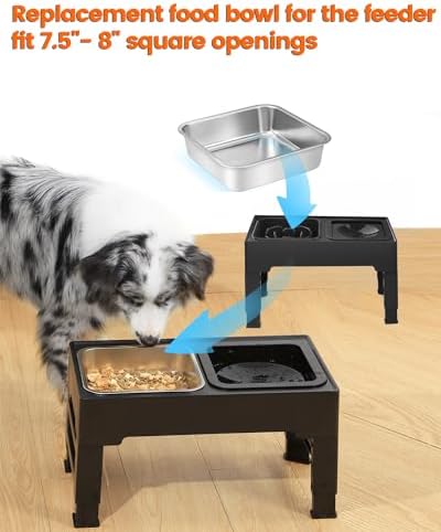 Replacement Food Bowl for Raised Feeder: The extended edges allow the bowls to be used in a raised feeder, fits square openings from 7.5″ to 8″ in length, perfect replacement food bowl for the elevated feeder in the picture.