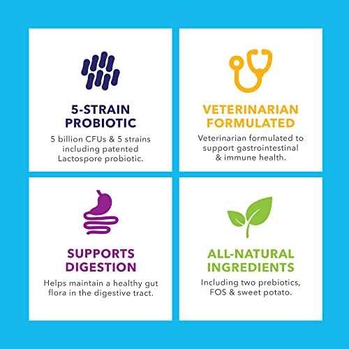 PREMIUM PROBIOTIC SUPPLEMENTS FOR DOGS & CATS – Our clinical-strength soft dog treats are made with maximum-potency Probiotics to support healthy digestion. Featuring five of the most beneficial probiotic strains in dogs and cats, with 5 billion CFUs per chew!
