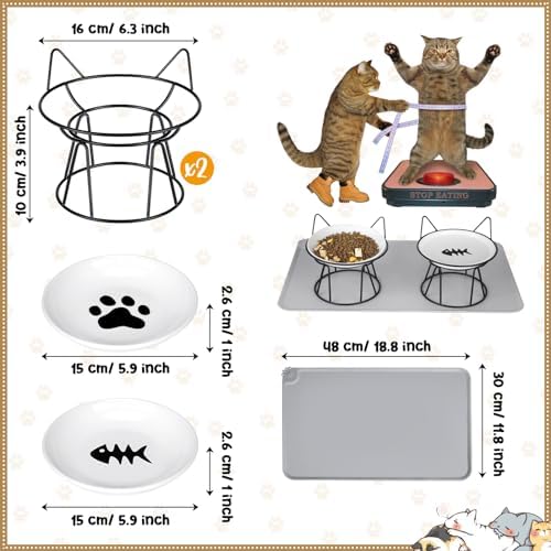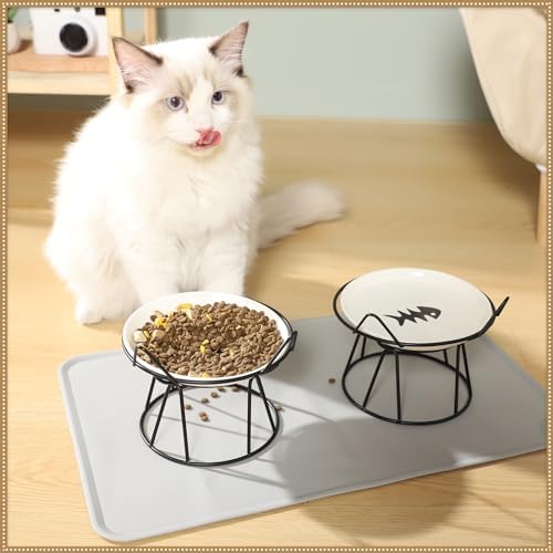 Weirui Cat Food Bowl Raised, Double Small Cat Dish with Pet Bowl Mat 15°Tilted Cat Ceramic Bowl Stand Anti Vomiting Cat Wet Food Dish for Puppy Kitten and Small Dogs(Black)